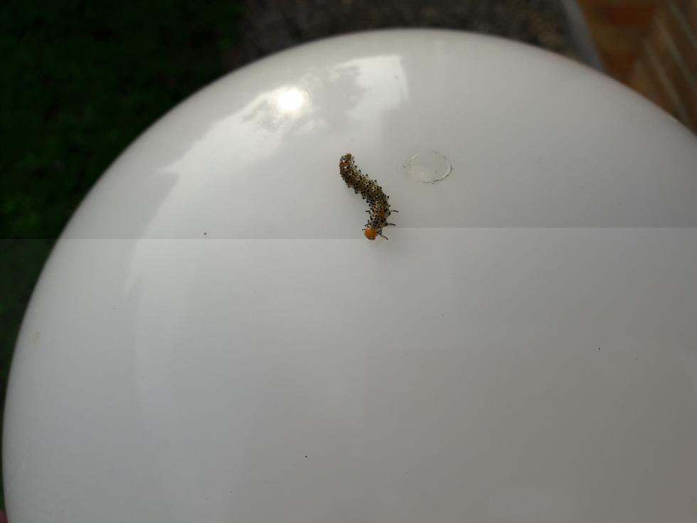 Quella della foto è quasi sicuramente una larva matura (per via della capocchia gialla, quelle di 2^ età ce l'hanno nera) di Arge pagana , una tentredine, ma non punge, divora letteralmente le foglie rosicchiandole partendo dal margine.