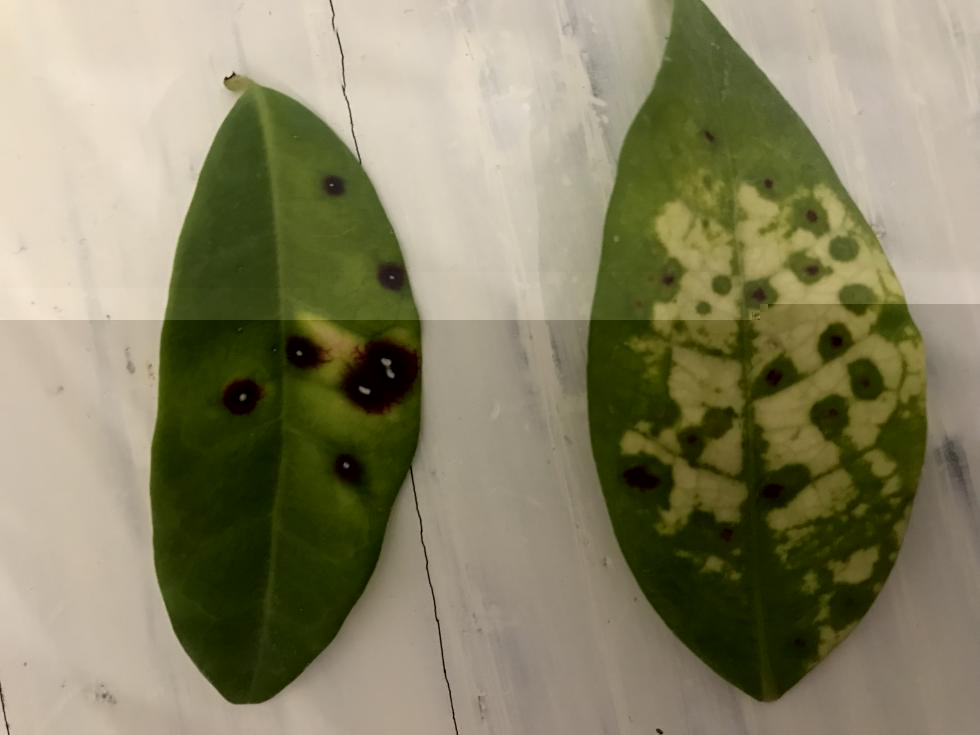 Le maculature brune col centro chiaro sono dovute a un attacco fungino. Per la seconda foto non riesco a capire se le parti bianche siano smangiature o scoloriture: dovreste precisare voi potendo osservare direttamente in loco.