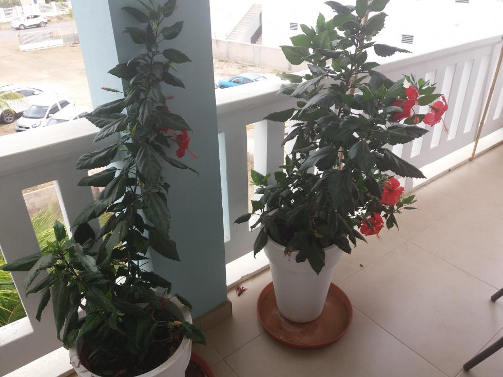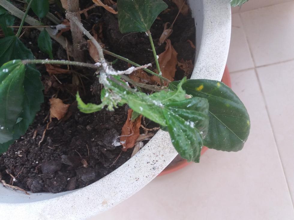 Buongiorno a tutti. Ho bisogno del vs aiuto da esperti...più di me!!!! Ho sul mio terrazzo due belle piante di Ibiscus acquistate insieme. Le ho posizionate in due punti diversi del terrazzo. Uno vicino alla ringhiera e prende molto sole dalle 12 al tramonto, e l'altro un po più all'interno che prende il sole in maniera diversa dalle 16 al tramonto poichè appunto posizionata nella parte più interna del terrazzo. Annaffio le piante a giorni alterni dopo aver constatato che il terriccio non è umido. Da qualche tempo la seconda pianta, quella più all'interno, presenta dei ciuffi bianchi, come da foto allegata, Ho letto che si potevano eliminare spruzzando i punti con acqua e sapone da cucina ma purtroppo non ho avuto nessun risultato. Chiedendo in giro c'è chi mi dice che prende poca luce solare .chi troppa....!!! Ogni 15-20 giorni mischio nell'acqua un concime adatto alle piante da fiore. Premetto che vivo in un'isola dei caraibi nelle antille olandesi e che la temperatura non scende mai durante l'anno sotto ai 25°. Mi aiutate? Mi date qualche consiglio? Un ringraziamento....