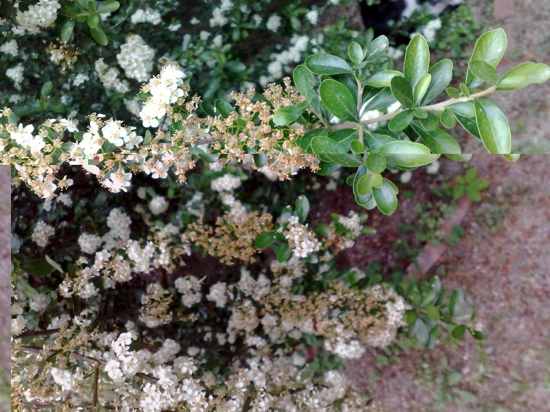 Direi che sono delle belle pyracantha...hanno le spine? Se si tratta di loro, come credo, vedrai che dopo che avranno sfiorito si riempiranno letteralmente di bacche coloratissime di colore rosso fuoco, arancio o giallo oro. E' una pianta molto rustica e si può lascir crescere libera (diventa molto grande con gli anni e bellissima) oppure potarla come siepe o arbuso isolato dalle forme più disparate. Per tutto l'autunno e buona parte dell'inverno sarà uno dei pochi fulcri colorati del giardino. Una pianta forse un po' dimenticata e sottovalutata, che amo mmoltissimo anche per le sue belle fioriture primaverili.