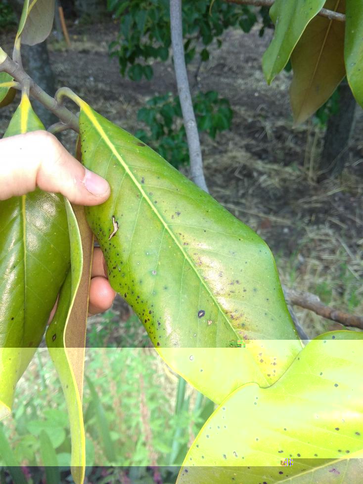 Ho un albero di magnolia che si presenta in questo stato come da foto. È un albero di almeno 20 anni alto un 5 metri, le foglie sembrano appassire. Ho fatto Delle foto ad alcune foglie e presentano macchie nere. Cosa può essere è recuperabile?