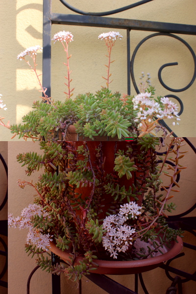 Salve Rizoma, ben tornato Concordo con Ilona: sicuramente è un Sedum e, quasi sicuramente (ma potrei togliere anche il "quasi") un Sedum album murale, pianta grassa comune in Europa e Asia ( pare anche in Siberia) Qua in Sardegna in genere, crescono altri tipi di Sedum, a Sassari, in particolare su zone rocciose o nei muretti a secco cresce un altro tipo di sedum con le foglie più lunghe e strette e produce fiori gialli, ma non so il nome della specie. Saluti Pedru