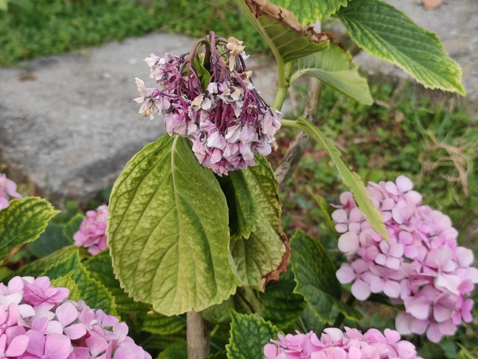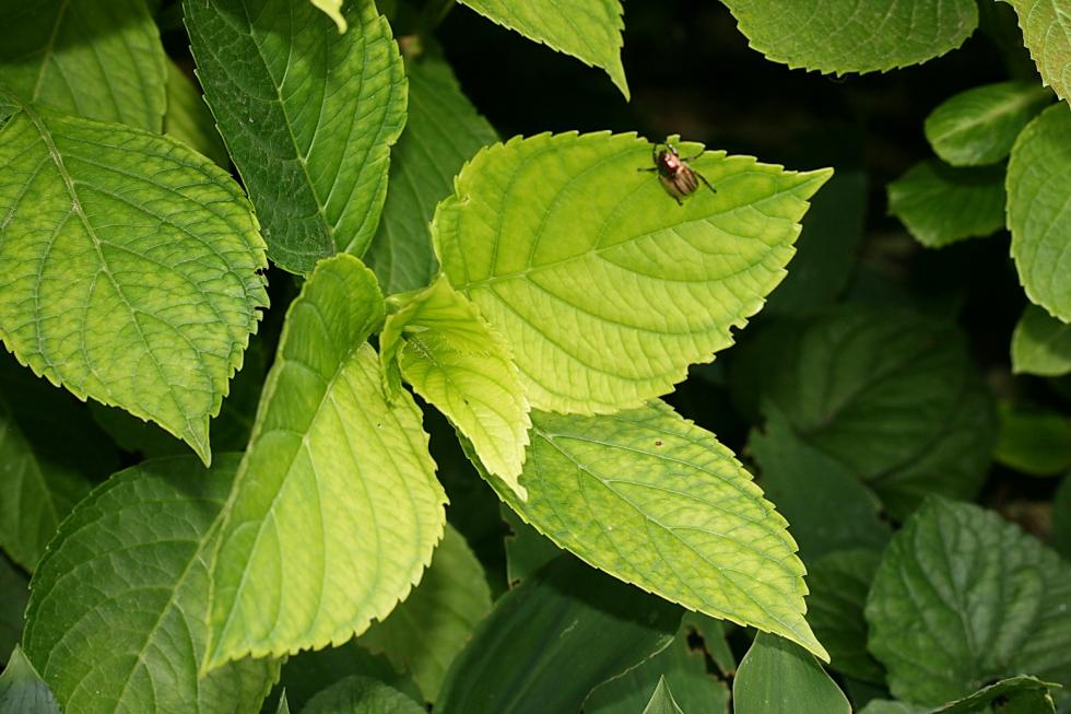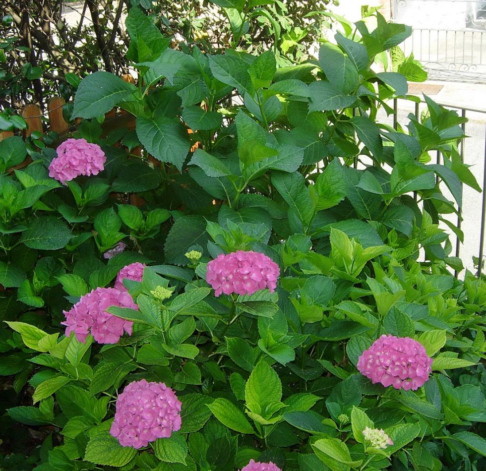 La clorosi è un fenomeno piuttosto comune sulle ortensie: anch'io ho dato ferro e concime ma come vedi da foto in attach alcune hanno foglie verdi mentre altre sono un poco sintomatiche (potrebbe dipendere anche dalla varietà), tuttavia appaiono rigogliose; dalla foto non si vede bene, ma quella più grande in fondo mostra le foglie apicali ripiegate pur essendo le 11 di mattina con 25 °C e zona a nord: questo perché la siepe di cinta che ripara a sud-ovest è stata potata pochi giorni fa e questo è l'effetto del mancato ombreggiamento (l'ho subito notato dopo la potatura).