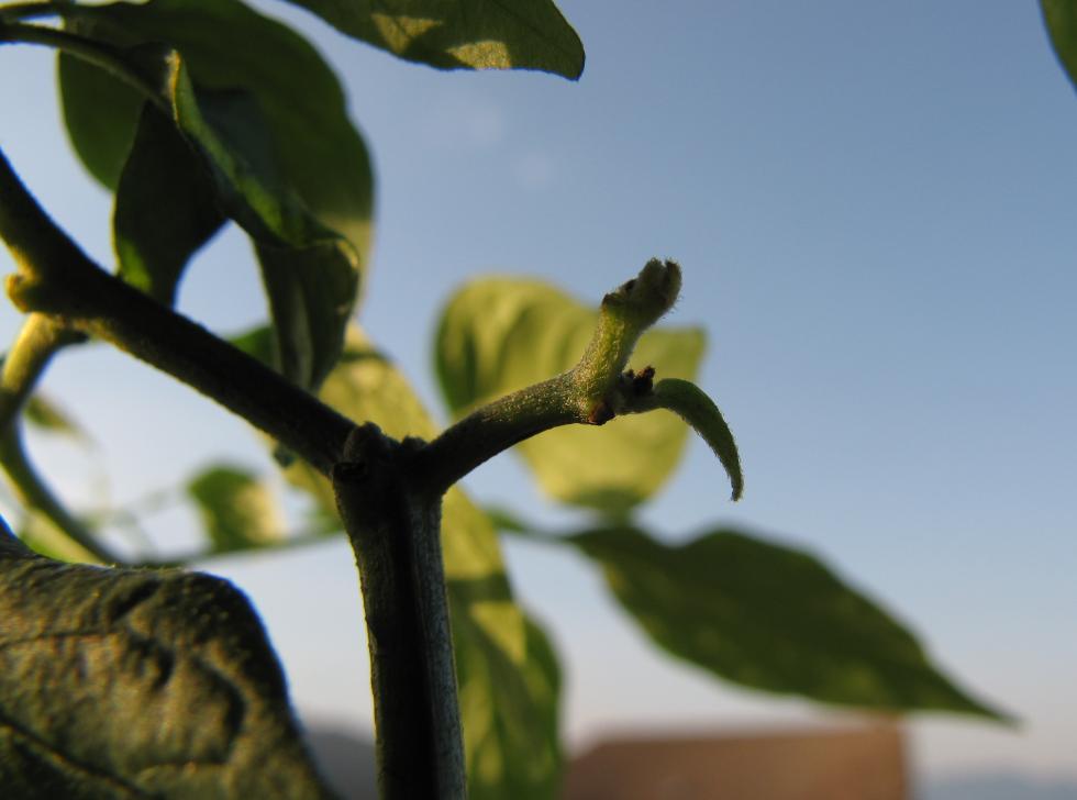 Invece la piantina innestata si sta sviluppando in fretta, anche il secondo rametto ha la prima fogliolina, i boccioli cadono ancora...