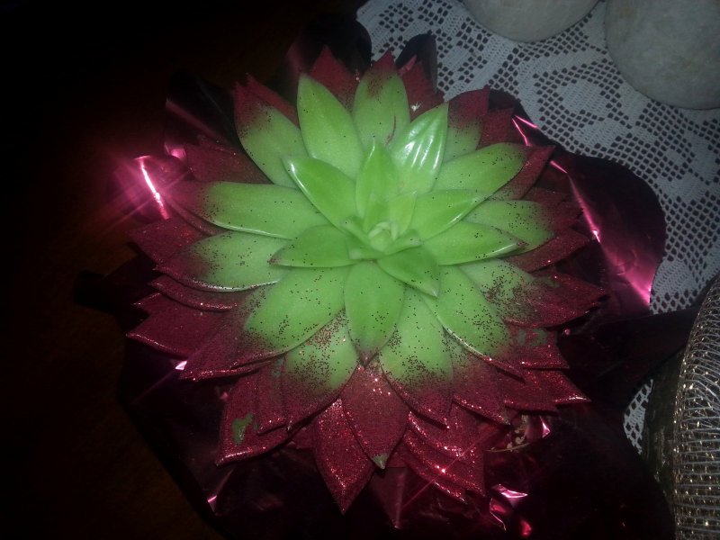 Era tutta contenta perchè dice che è stupenda con tutti quei brillantini e quel colore rosso brillante, infatti pensa che sia propria la pianta fatta così e non che è stata verniciata per motivi di business.