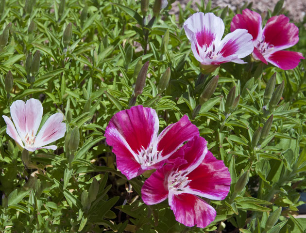 Qualche mese fa acquistai via internet alcuni semi di fiori in un vivaio francese. La proprietaria, molto cortese, mi inviò un piccolo cadeau, una bustina di semi sconosciuti che seminai e che hanno prodotto questo delizioso cespuglietto variopinto. I fiori stanno sbocciando adesso e le corolle sono larghe complessivamente intorno ai 5-6 cm. La pianta è bassa e folta, l'altezza non supera i 15 cm e spero che sia una pianta perenne, perchè mi piace tanto, ma...che pianta è?! :roll: