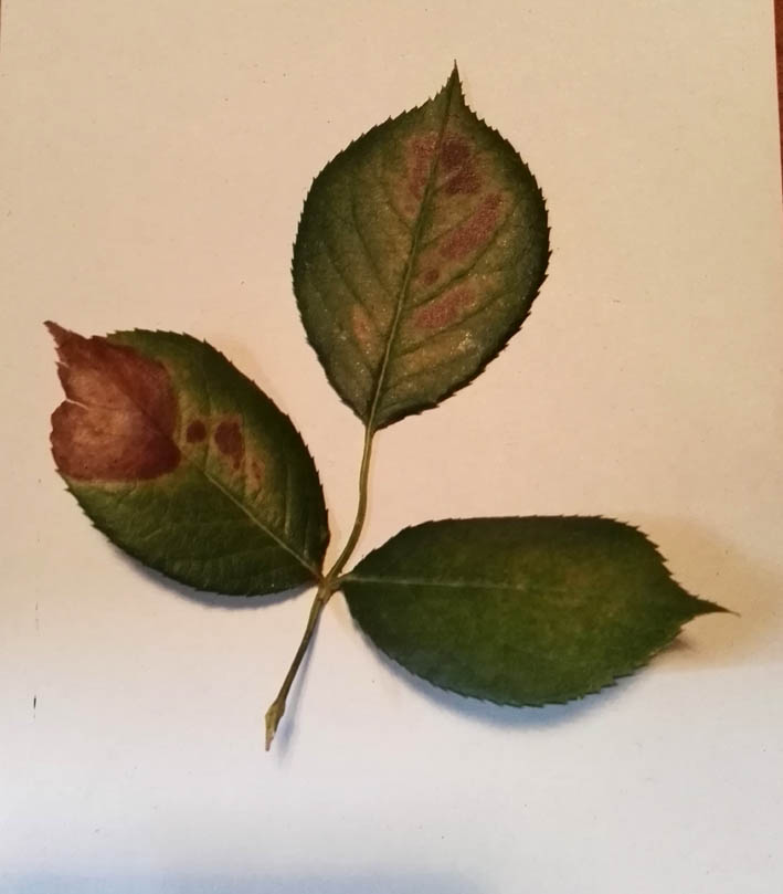 Ho trapiantato in primavera una rosa rampicante che ha attecchito bene, mi ha già dato dei fiori ma stamane ho scoperto delle macchie in alcune foglie come da foto. La pianta è in un cortiletto interno dove corre poca aria e quando il sole è alto la temperatura sale molto. Temperatura troppo alta o malattia? grazie