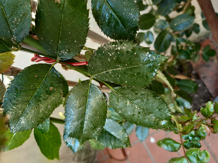 La rosa rampicante che ho nel mio cortile , trapiantata da un anno, quest'inverno non ha perso tutte le foglie e ha messo regolarmente i nuovi getti. notato che c'erano degli afidi ho dato il con piretroidi, dopo qualche giorno nelle foglie è aspparsa una melata lucidas e appicicosa e vi sono attaccate quelle che mi sembrano moschine bianche. Qualcuno può spiegarmi cosa è successo. Mi scuso per le foto che non sono molto chiare.trattamento