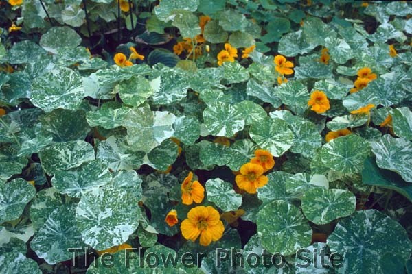 Potrebbe essere Tropaeolum majus 'Variegatum' (foto http://www.theflowerphotosite.com/sp/t294.html)