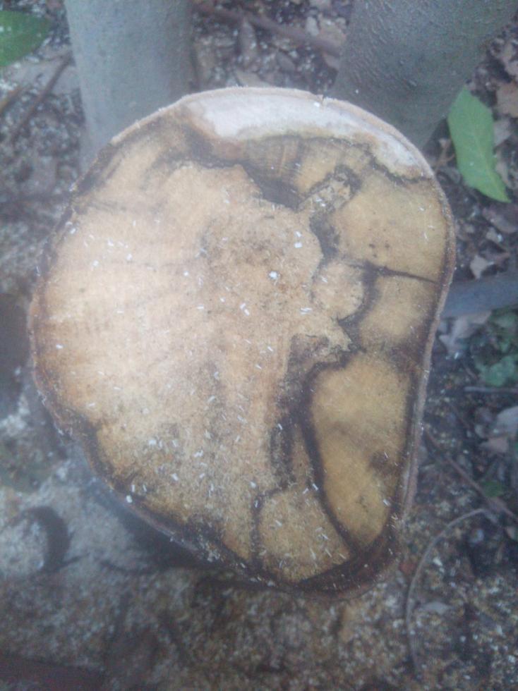 ho tagliato il pezzo di alloro che sembrava stentato e anche due altri tronchi della stessa siepe, che avevano foglie solo in cima. Ho visto che il tronco più grande aveva delle macchie scure dentro, gli altri sono bianchi tranne qualche piccolo punto scuro. E' una malattia?