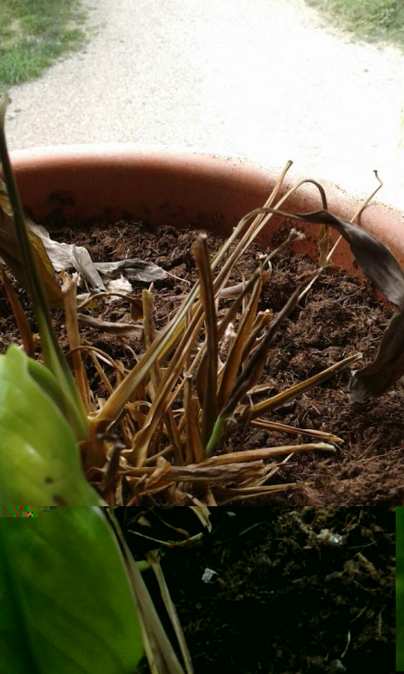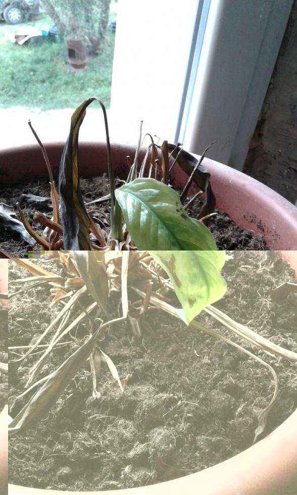 Questo che vedete nelle foto è quello che resta del mio Spathiphyllum. Poco per volta tutte le foglie fanno la stessa fine, e ora sono quasi finite del tutto. Sbocciano, si aprono, e dopo qualche giorno cominciano a diventare nere e si afflosciano. Ora ho visto (si vede in basso a destra nella seconda foto) che non riescono neppure più ad aprirsi, si anneriscono prima.