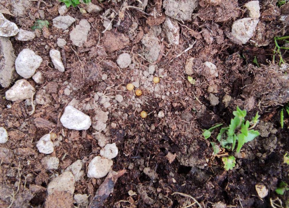 Buongiorno, ho acquistato un paio di piante per il giardino in un vivaio della zona. Dopo avere preparato la buca le estraggo dai vasi e rompo la terra per liberare le radici. Sono saltate fuori un sacco di palline gialle (vedi foto). Cosa sono? Uova di insetti o altro?