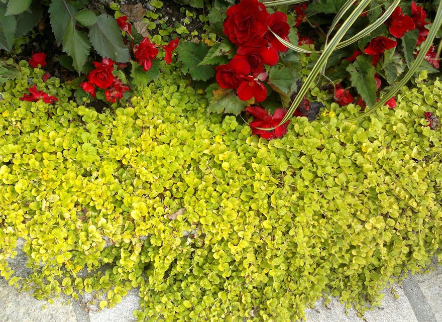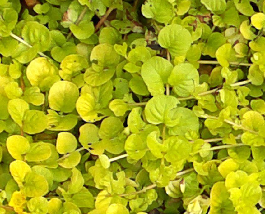 purtroppo non è la dichondra, che pure ho in giardino e mi piace molto. La dichondra non è amante del pieno sole, questa pianta invece sembra prediligere un'esposizione assolata e non deve temere il freddo, visto che era in montagna anche se non certo ad alta quota (circa 1000 metri di altitudine). Ha un colore giallo-verde chiarissimo, le foglie sono piccole e opposte, ed è una stolonifera. Si propaga tramite lunghi stoloni che ricoprono tutto lo spazio, creando un tappeto luminoso.