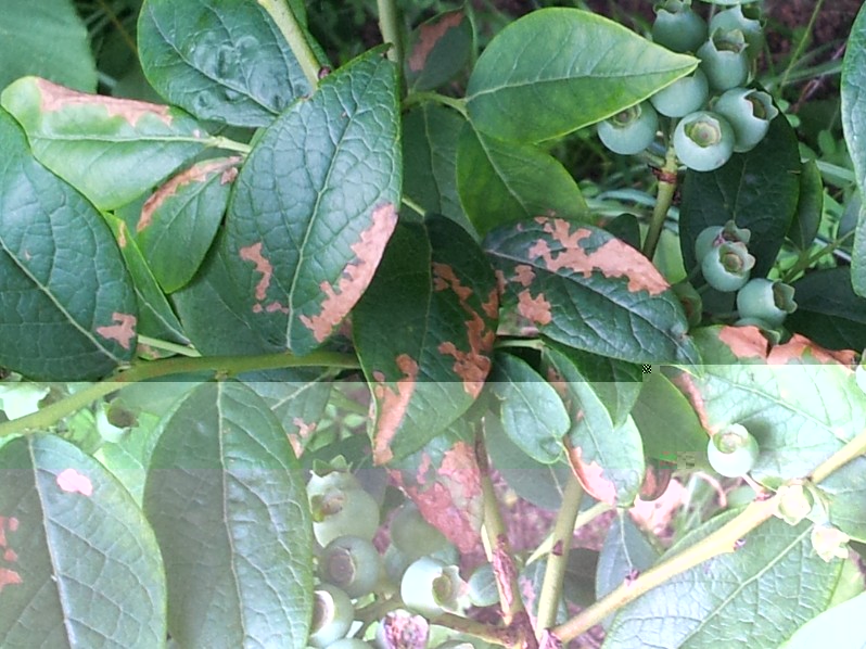 Per la prima foto non saprei, ma se non sono tante non mi preoccuperei visto che si intravedono ottimi mirtilli. Per la seconda è clorosi, che è causato quasi sicuramente dall'alto ph del terreno dove sono piantate.