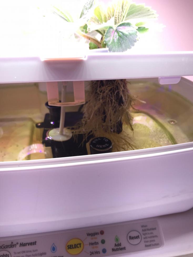 Tarty81 ha scritto: Ciao, hanno un bel verde... Non credo che hanno qualche carenza... Ilona ti saprà dire qualcosa in più. Volevo domandarti come gestisci le ore di luce e di buio? Le radici sono immerse in acqua e materiale inerte? Il concime come lo somministri mensilmente o hai un circuito già miscelato. Non so nulla è mi interessa molto... È il futuro nella coltivazione. Tienici aggiornati!!! Saluti angelo Ciao Tarty81  Il sistema può essere regolato a 16,18 o 24H di luce, io personalmente lo tengo a 18 ore perchè la varietà che sto coltivando è autofiorente (se non sbaglio Fragaria vesca "Annabelle"), quindi non ha bisogno del cambio di fotoperiodo di luce per fiorire. In caso comunque basta attaccare un timer. A me piace un sacco coltivare indoor e per le piante che hanno bisogno di un cambio di fotoperiodo, ad esempio i peperoncini, uso 18 ore di luce per tenerli in vegetativa e 12 ore di luce per farle fiorire. Per la seconda domanda si, le radici sono completamente immerse in acqua ti posto anche una foto. Il concime ho preparato una soluzione prima di avviare la coltivazione, poi successivamente una volta a settimana li faccio un rimbocco d'acqua, gli regolo il ph e gli aggiungo i fertilizzanti e per ora sembra procedere veramente bene. Speriamo  vi tengo aggiornati comunque sicuramente. Personalmente se qualcuno volesse avviare una coltivazione in idroponica gli consiglierei un impianto più grande, con 200€ prendi un buon kit con almeno 150W di luce.