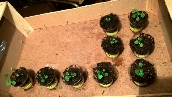Sono ancora pieno di bonsai di fragole. Ho trasferito su terra le piantine nate nel cotone e nella carta assorbente, visto che non crescevano. Poi ho rinchiuso in una scatola di cioccolatini e messo in balcone, dove finalmente avranno sole in abbondanza.