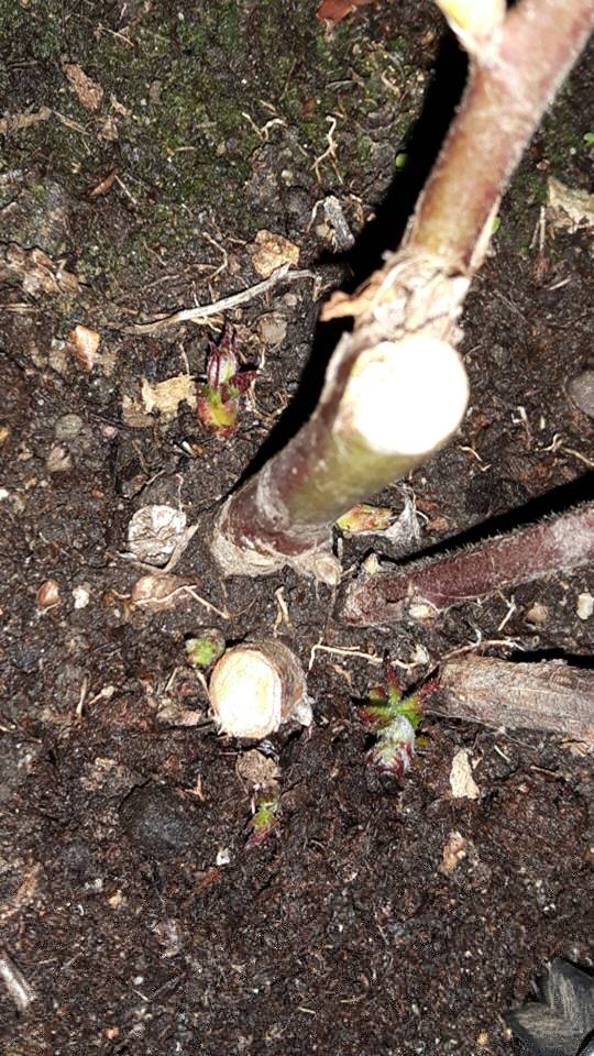 Unica accortezza...l'ho potata lasciando solo 2 rametti di 10-15 cm l'uno con poche gemme........se lasciavo la pianta grande...magari avrebbe avuto pochissima forza per crescere e spollonare ( avendo le radici strappate e danneggiate )..mentre non avendo + fusto...tutta la sua energia l'ha utilizzata per far crescere nuovi polloni........