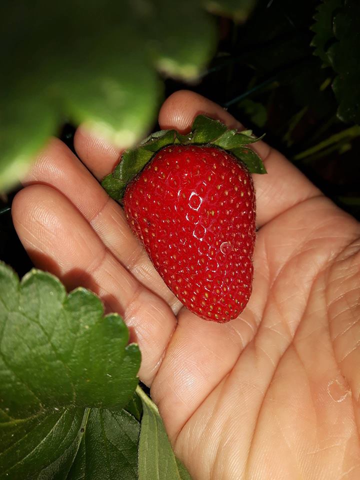 Ho fatto una foto col flash per vedersi meglio ( questa è un altra fragola..ma son tutte cosi di forma ) Hanno un profumo che si sente avvicinandosi e idem se le tocchi.....colore vivo e son sode....sono le candonga sarde queste