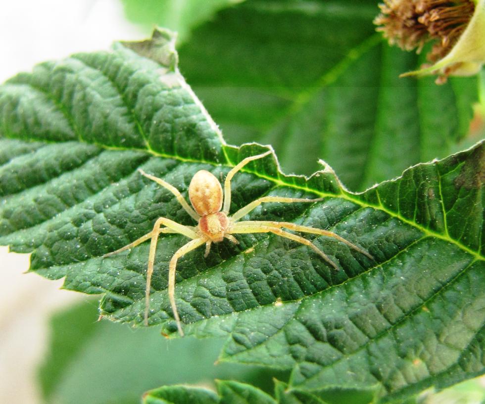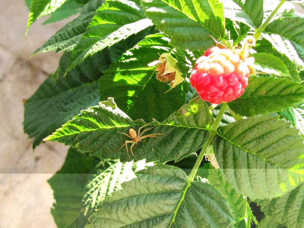 Un simpatico ragno granchio sul lampone. Lo chiamano anche ragno dei fiori, oppure in inglese - crab spider  . Questo ragnetto ( sono di diversi colori ) appartiene ai Thomisidae ed è un cacciatore di insetti, infatti si trova sulla foglia che qualcuno ha mangiucchiato  , spero proprio che il colpevole è stato punito...