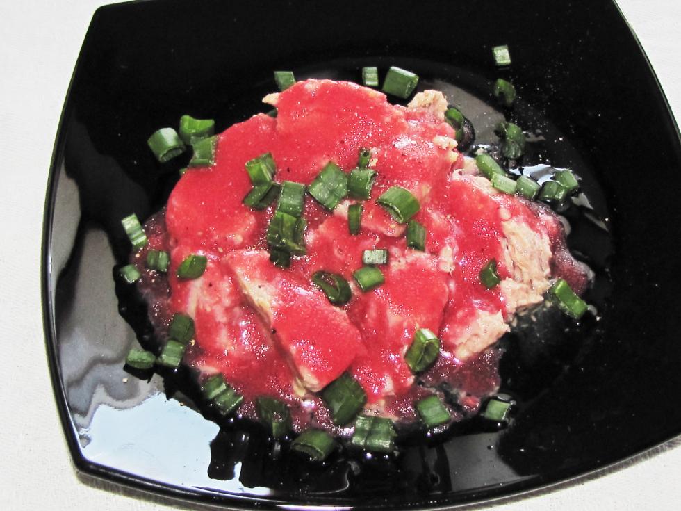Tatatatan... tonno con ribes rosso... Accipicchia - mi piace... quasi come lo avevo immaginato e... anche bello frizzante...  ( ho passato a setaccio le bacche di ribes + un pizzico di sale + un cucchiaio di olio di oliva + pochissimo pepe = una bella amalgamata ) @Stail: postami altre foto... magari prima di pranzo... quando ho fame...