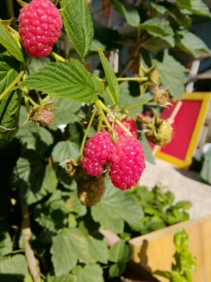 Ho notato con piacere che il rametto comprato a 3 euro in marzo è diventato un bel lampone rifiorente. Inoltre ha fatto un piccolo pollone ai piedi. Felicissima!