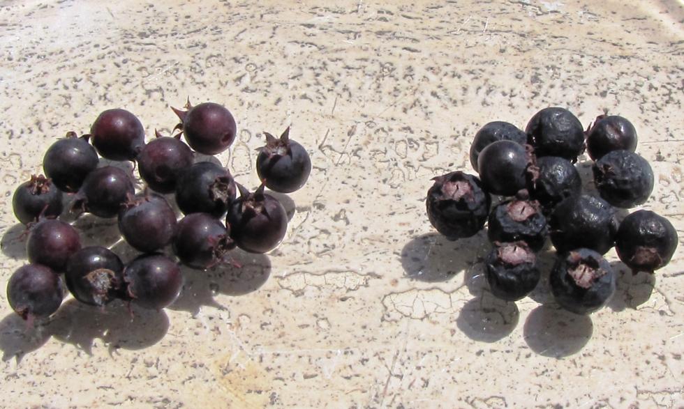 I primi pomi d'Amelanchier Obelisk ( a sinistra ) e gli ultimi d'Amelanchier lamarckii ( a destra ) Mentre vi scrivo, sto assaggiando le bacche e, anche se sembrano uguali, sento una bella differenza nel sapore. I pomi di lamarckii sono contemporaneamente dolci e un po' amari, invece i pomi d'Amelanchier alnifolia sono meno dolci, però non percepisco quella nota amara che non mi piace quando mangio le bacche di lamarckii, bensì sento molto chiaramente il sapore di una mela non molto dolce. Sono particolari, buoni