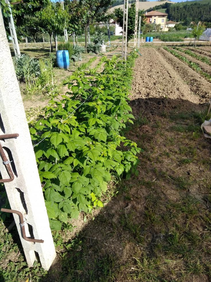 I lamponi invece iniziano a fare e fiori mentre in altra zona quelli non tagliati a zero hanno i frutti già rossi.