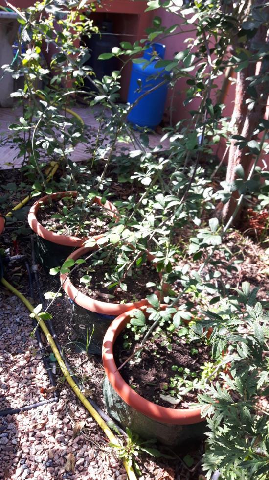 scannus ha scritto: Ciao ,, allora vediamo di fare chiarezza ,che sono un po' confuso  . La pianta è stata comprata e messa in vaso l' anno scorso e lì rimarrà , a oggi presenta due nuovi polloni uno da due metri e l' altro da 1 mt ,diametro circa di una matita , e quest' anno non ha fatto fiori , ora se ho capito bene a febbraio devo potare i polloni per rinforzare l' apparato radicale e forse sperare nelle prime more già dall' estate prossima , quindi sti due polloni come li poto ? Li tagliero' alla base come i lamponi o a 20 \ 30 cm dal ceppo ? ,, seconda domanda invece di sprecare questi polloni li posso interrare nei vasetti diciamo al centro del pollone e a primavera tagliare per avere gia' delle nuove piantine ? Ovviamente grazie per i consigli Ho fatto qualche foto ma tra la luce e il groviglio si capisce poco.....nella 3 foto ho messo le linee rosse per far capire dove vanno i polloni......... nella prima foto ci sono i ceppi e i polloni che partono e arrivano nei vasi della foto 2............in pratica non ho effettuato nessuna potatura.......è come se avessi un rovo....piante a + radici......molti rami laterali li ho interrati anche sul terreno, un po qui un po li......... la tua mora di che varietà è? hai solo 1 vaso grande dove sta, o hai possibilità di altri vasi o di terreno vicino al vaso da utilizzare^? grandezza del vaso in cm? se postavi qualche foto era tutto + semplice.......ti si consigliava meglio