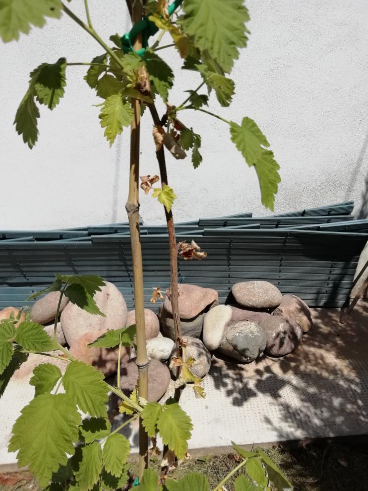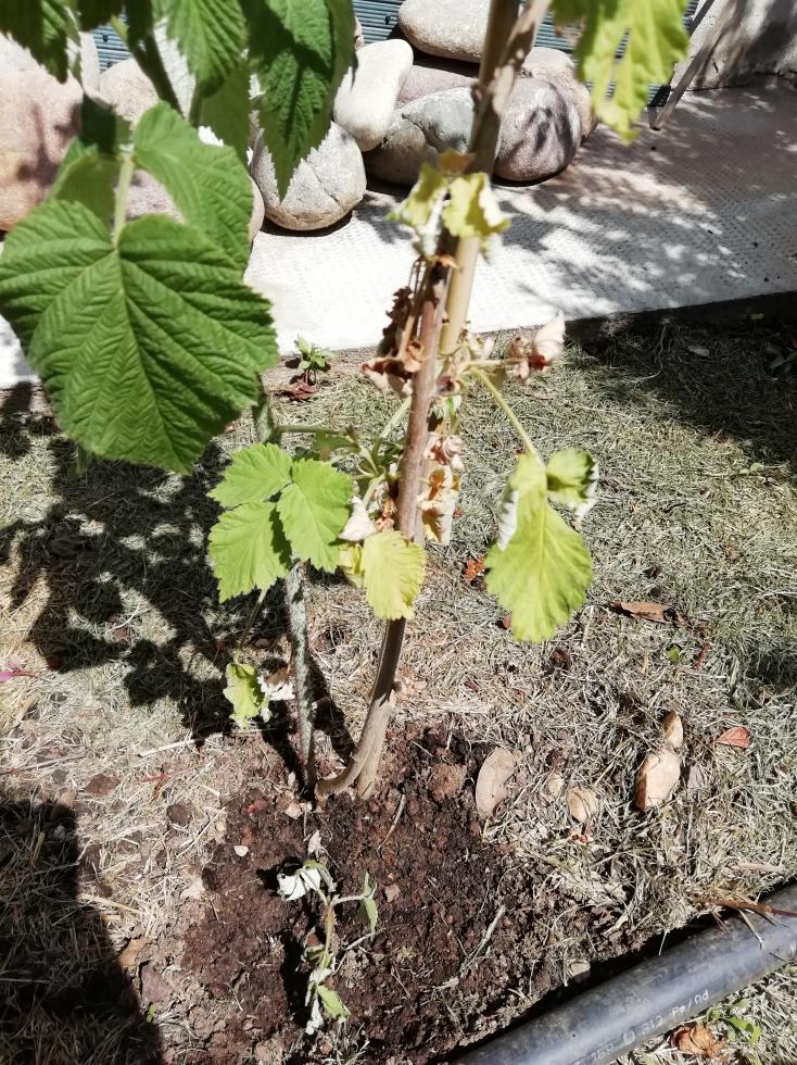 Buongiorno a tutti, il problema si è ripresentato. Un pollone si è già completamente seccato, mentre quello piccolo dell'altra volta non è cresciuto per niente nelle ultime due settimane e oggi si presenta così. Anche le foglie del tralcio dell'anno scorso (è un lampone rifiorente) hanno cominciato ad ingiallire e a seccarsi.