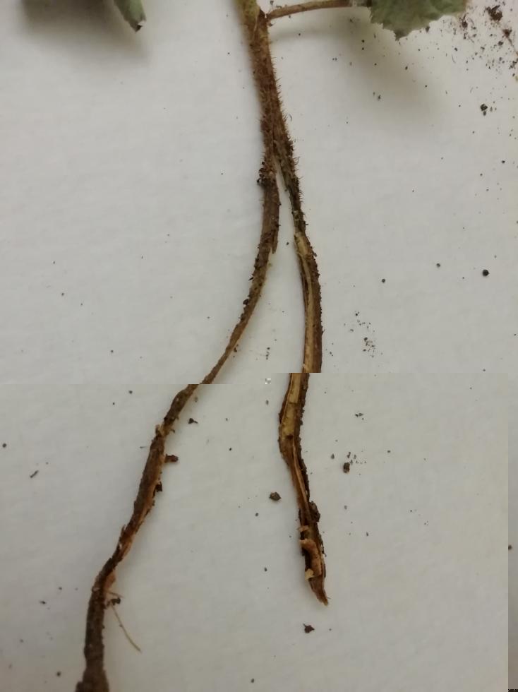 Ancora una cosa. Visto che hai tirato via la piantina, se non la hai buttata prova a spellare il fusto per vedere se sotto l'epidermide compaiono striature bluastre come quelle della foto allegata