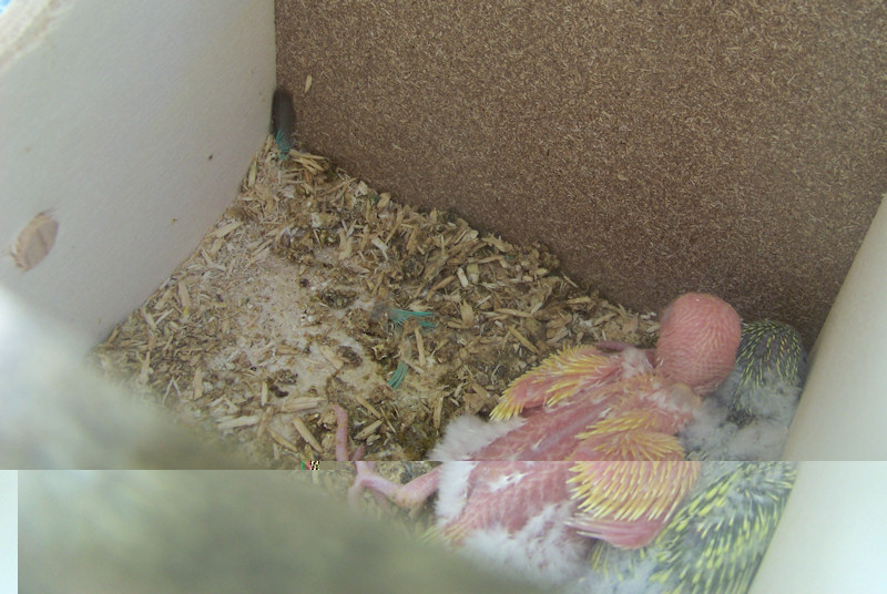 Siccome entrambe le femmine sono sempre nel nido, una settimana fa ho aperto il nido esterno ed ho visto che c'erano 4 uova, due giorni fa, mentre la femmina blu era fuori, ho controllato il nido e c'erano 3 uova e un piccolo pappagallino nato.