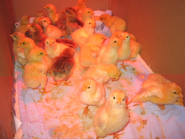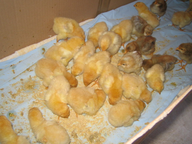 Una trentina di pulcini di bionda piemontese fulvo a coda nera, livorno collo oro ed altre colorazioni sperimentali. Foto a 4 giorni di vita.