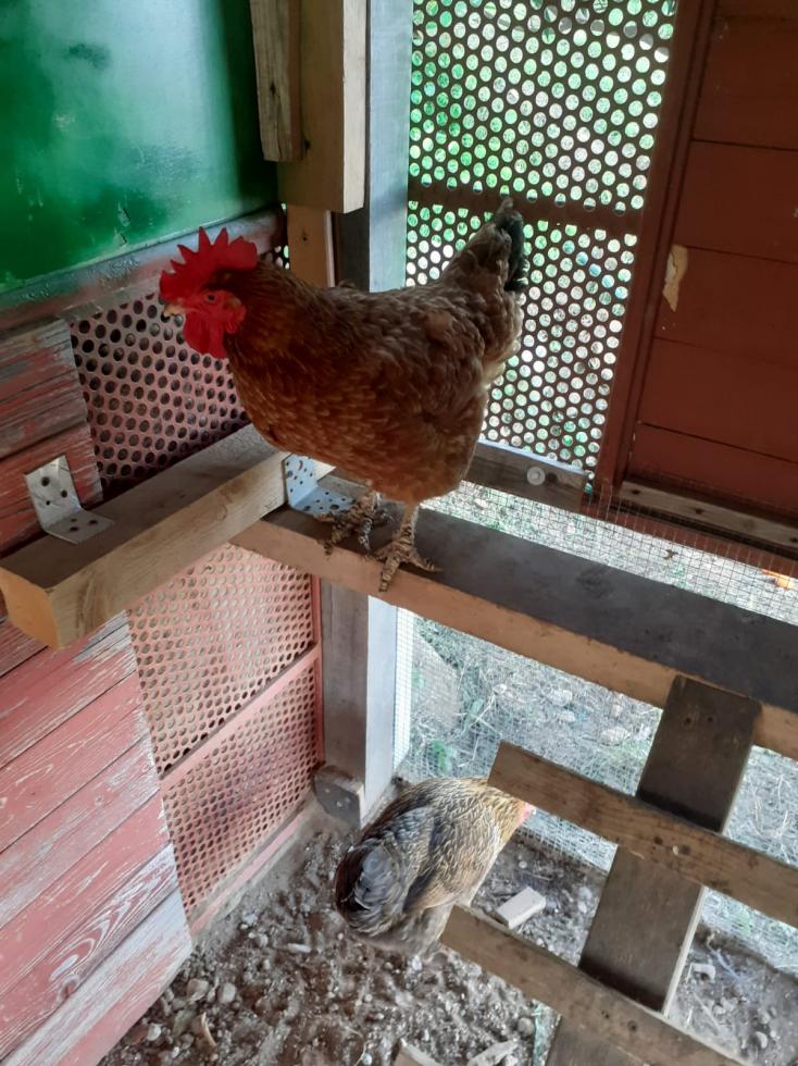 La gallina sta in disparte rispetto alle altre due (potrebbe anche essere perchè è arrivata dopo), ha meno voglia di uscire, quando esce è meno dinamica della altre.