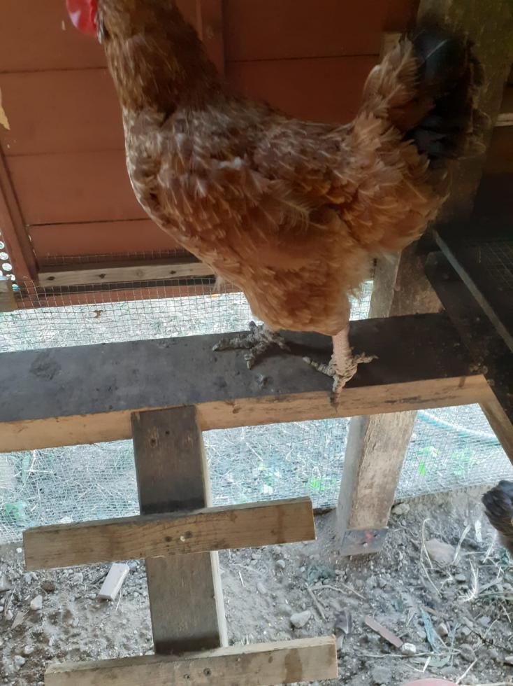 Una delle tre galline, l'ultima delle tre acquistate, acquistata non al consorzio agrario ma presso un allevatore locale (non l'ho comprata io e premetto che non mi fido per nulla dei metodi e sospetto che non abbia nessun titolo ad avere un allevamento) presenta delle rugosità sulle zampe e ha qualche piuma arruffata.