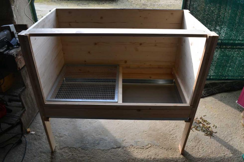 Stai facendo un ottimo lavoro.. Ti consiglio un fondo in rete che sia asportabile..e sotto un cassetto raccogli feci.. Sopra se cmq la terrai al riparo in qualche rimessa può bastare un coperchio di rete con maglia da 1cm..