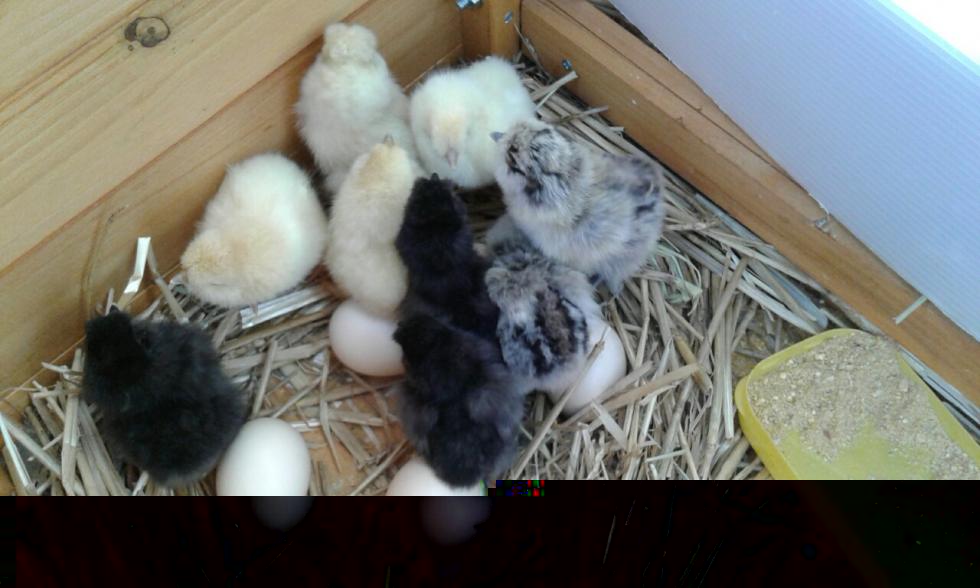 Poi più niente per due giorni, e non sapevo che pensare... poi pian piano sono nati altri pulcini: in tutto 2 sotto la cocincina e 9 sotto Louise, la moroseta. Nel frattempo, poiché erano passati diversi giorni, ho ritenuto opportuno portare da mangiare e da bere alle chiocce, che hanno molto gradito.