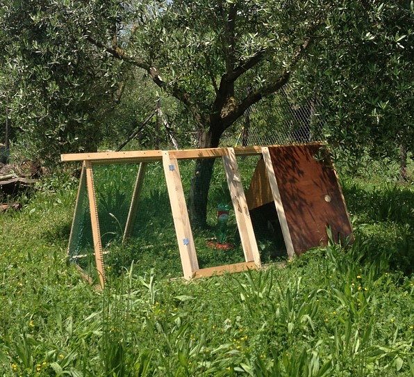 ecco la foto dell'arca, comodissima per una chioccia e la sua nidiata. L'handicap è che se il tempo è piovoso, l'erba è troppo umida e i piccoli non possono stare in un ambiente non idoneo appena escono dall'uovo nonostante la madre li scaldi tenendoli sotto di se'. In compenso il grande vantaggio è che, appena l'erba si sporca, te prendi e sposti l'arca ed ecco che il prato ritorna verde e pulito.