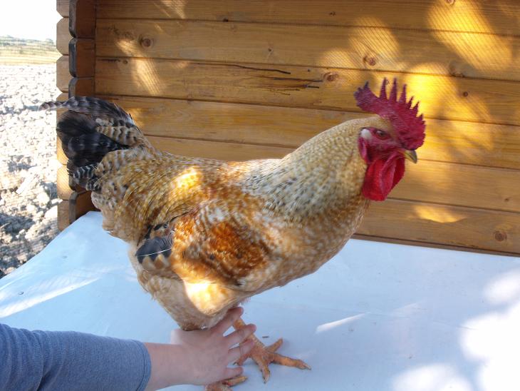 -un gallo ibrido da carne, di 5 mesi. Era parte di un gruppo di 10 pulcini ibridi da carne, 6 galline già macellate, due galletti già macellati, 1 gallina morta da un paio di settimane, per i danni inflitti da uno dei galli, e lui, unico superstite. Focoso. Aggressivo. Massiccio. Bellissimo. Assomiglia tanto al bielefelder, anche se è sicuramente un ibrido, metterò una foto. Mi dispiacerebbe eliminarlo. E' davvero bello bello.