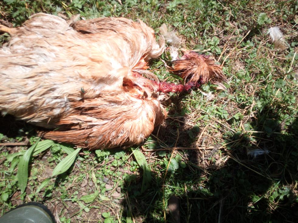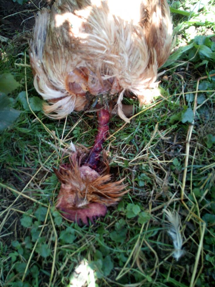 Ecco le due foto che ho fatto oggi... Quando l'ho trovata la cosa era successa da poco, c'era solo qualche mosca addosso... L'altra gallina era praticamente uguale, se non che aveva il petto più mangiato, ed era successo qualche giorno fa... Mi fa molto strano che sia mangiato solo ed esclusivamente il collo, testa perfettamente integra e che sia stata attaccata solo una gallina alla volta.