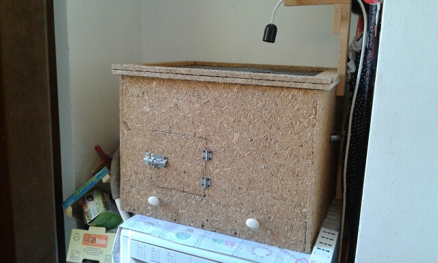 Questa è la mia. Non è altro che una scatola di legno con coperchio in rete, ha un grigliato interno removibile e un cassetto di raccolta. Lo sportellino serve per rifornire agevolmente acqua e cibo, e l'asta con il portalampada ha un passante per alzarla o abbassarla. Con una gabbia secondo me avresti troppa dispersione di calore