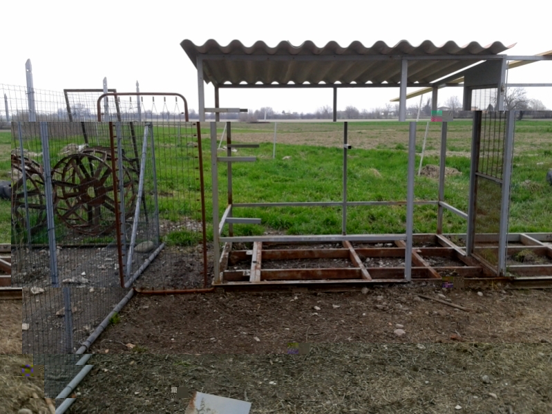 Se guardate bene le foto, il basamento in ferro della struttura ha uno spessore di 10/15 cm. Adesso il pavimento è fatto con dei pannelli di multistrato che sostituiró perchè marciti e pieni di feci. In ogni caso il nuovo basamento non sarà a contatto col terreno.