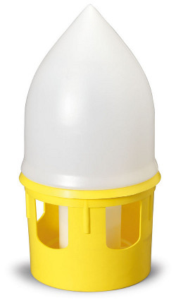 Io l'hanno scorso ho avuto l' occasione di provarlo. Un amico ne possiede uno e me lo ha prestato per qualche giorno. È un abbeveratoio furbissimo: i pulcini non insozzano l'acqua perché si abbeverano sporgendosi con il collo verso l'interno. Non hanno la possibilità di immergere le zampe nell' acqua. Non hanno la possibilità di salirci in cima. Come ho scritto in un post dell' anno scorso, trovo insulsi gli abbeveratoi classici a sifone con il tetto piatto: i pulcini ci saltano sopra, si appollaiano e lasciano cadere le feci direttamente nell' acqua. Con questo tipo di abbeveratoio non succede. L'acqua è protetta anche dalla terra/segatura/lettiera che viene alzata dai pulcini. Volendo lo si può anche costruire. Esistono varie misure. È più adatto nel caso di presenza di soli pulcini, la chioccia effettivamente farebbe più fatica a bere.