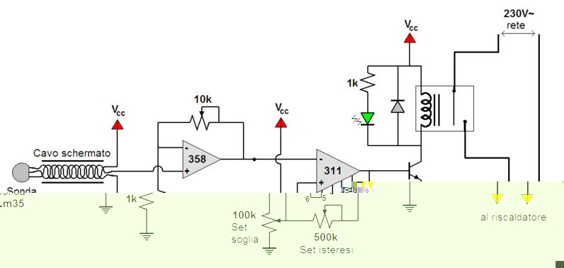 Ciao Bremen, ciao a tutti, spero che lo schema del mio termostato (funzionante) ti sia d'aiuto, al massimo lo mostri al tuo amico elettronico che te lo traduce in parole. Tutti i componenti sono di comunissima reperibilità e basso costo, la temperatura e l'istersi sono modificabili e se vorrai monitorare la temperatura da uno schermo potrai fare come me e aggiungerci un affare per smanettoni