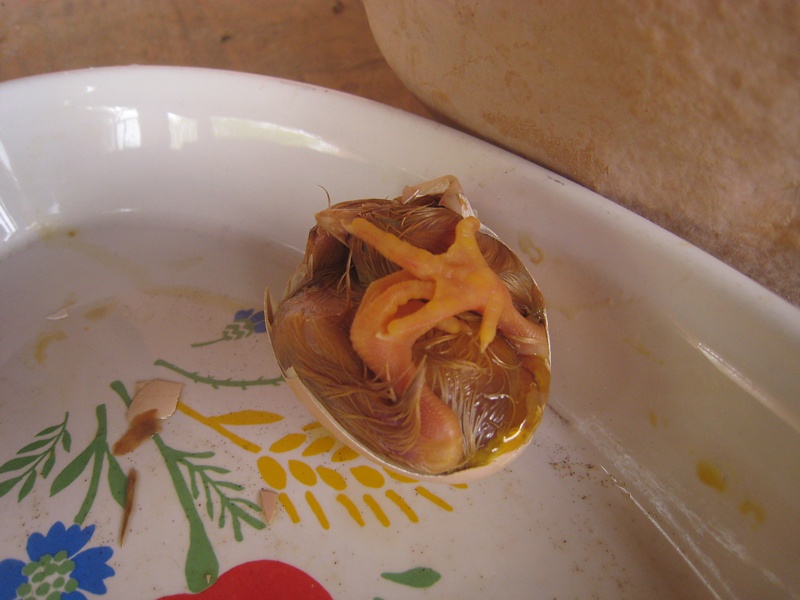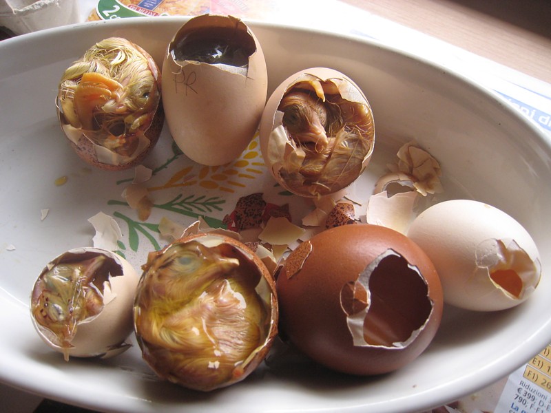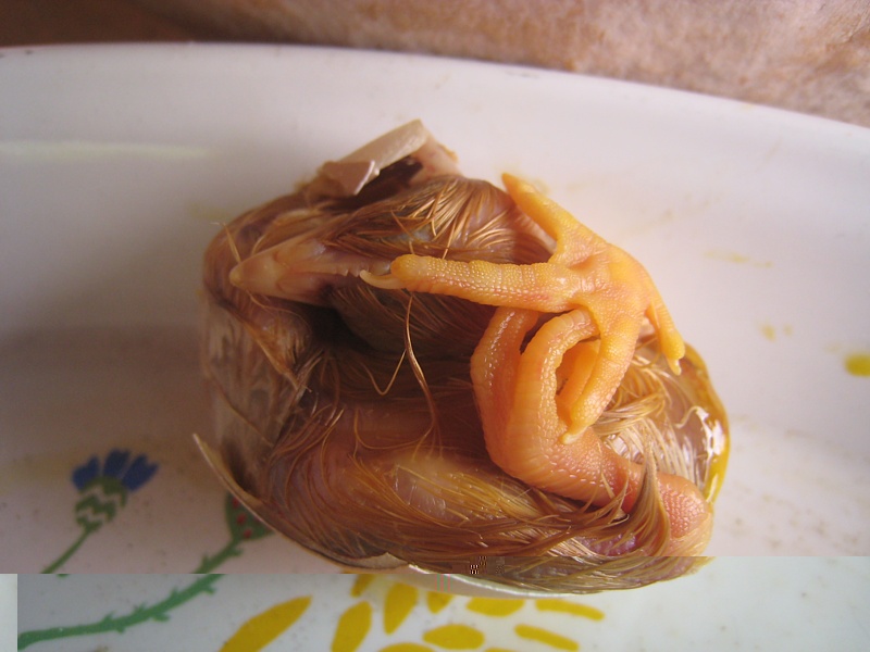 Le cause di morte in uno stadio di sviluppo così avanzato sono solitamente dovute all'asfissia perchè l'embrione non raggiunge la camera d'aria o non riesce a ruotare per incidere il guscio. Per questo temperatura, umidità, sporcizia centrano poco, molto di più la posizione di incubazione delle uova o ..... la Natura (un pulcino "debole" perchè frutto di troppa consanguineità o da soggetti vecchi ecc). Dispiace sempre aprire e trovare pulcini così! Voi che dite?