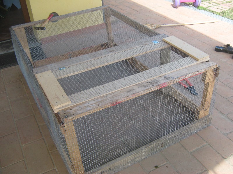 ciao a tutti. ecco le foto del gabbione a cui stavo lavorando da parecchi giorni.. fatto sta che il tempo era poco fra una cosa e un'altra, ma ora ce l'ho quasi fatta a finirlo. in pratica mancano un po' di chiodi e il chiavistello per la chiusura che ho preso stamattina in ferramenta, ma vista la bellissima giornata di oggi, ho voluto farlo provare ai mugellesini nati a Pasqua e alla loro mamma non mugellese. la tavola che si vede sopra nell'ultima foto l'ho solo appoggiata per fare un po' d'ombra.