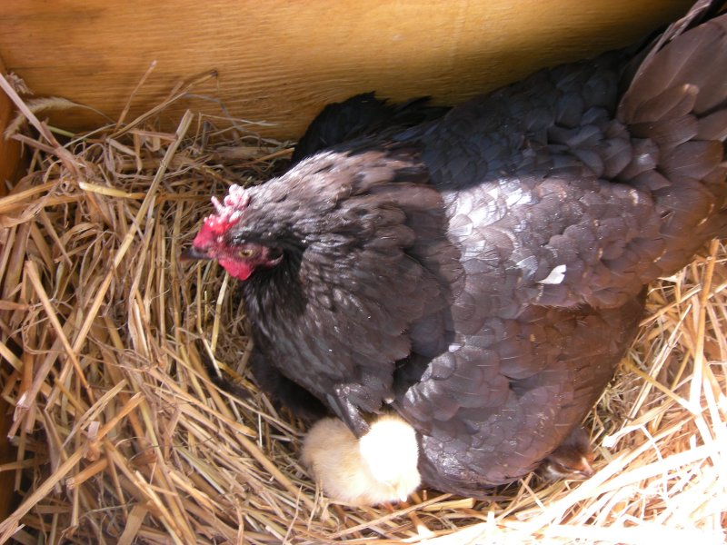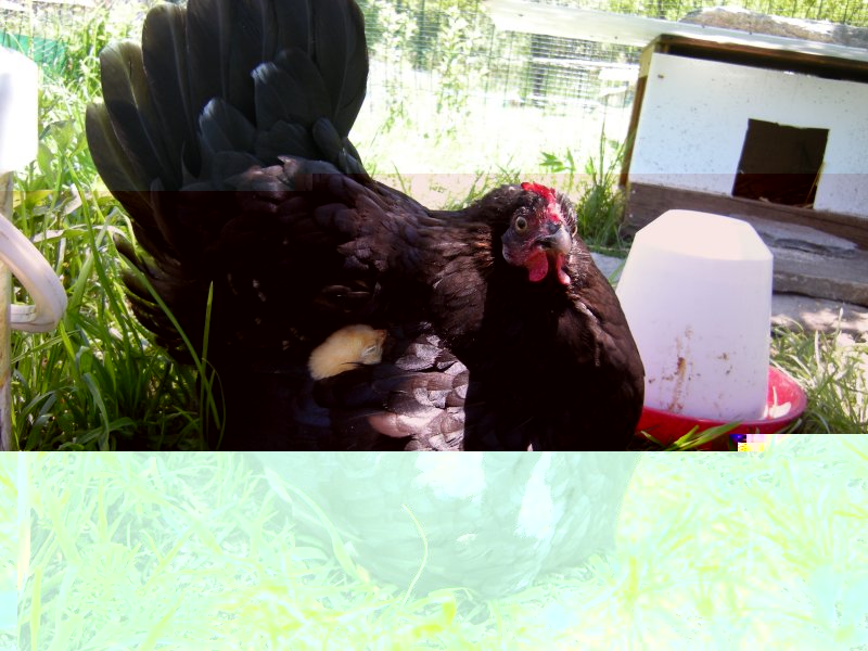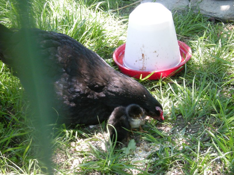 Ecco la mia Carmela (micro nanetta)! con 2 pulcini di Bionda piemontese e 2 pulcini suoi (neri) fatti con il gallo Biondo piemontese.