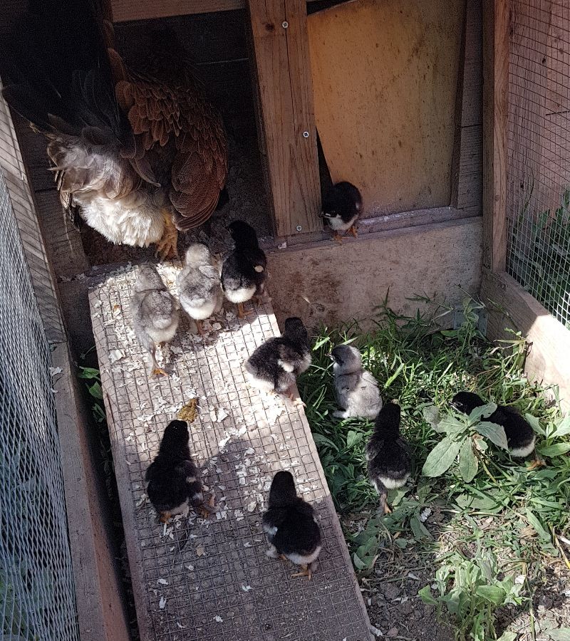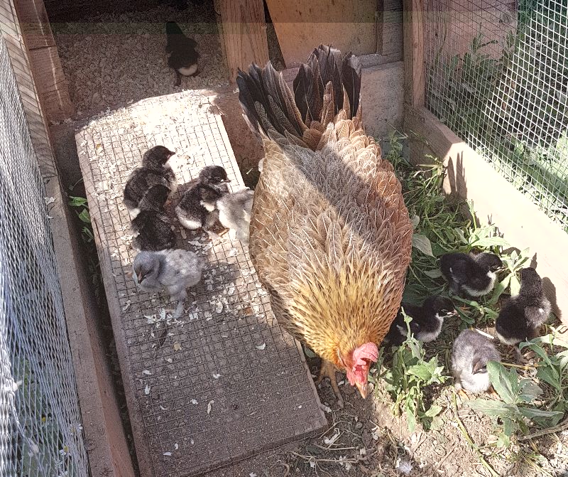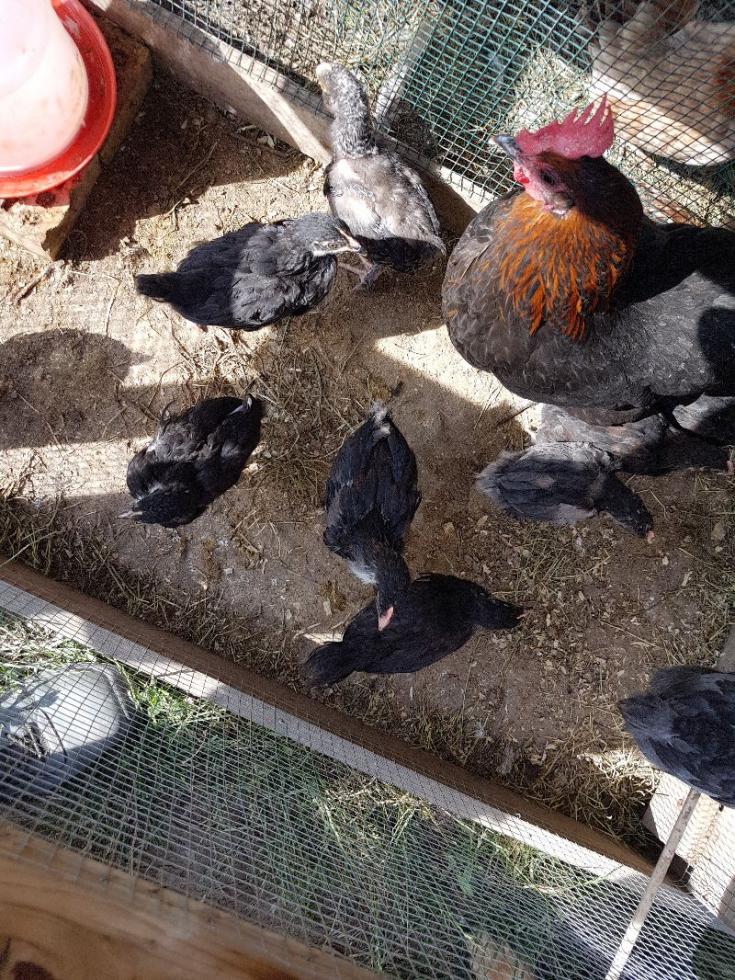 Chioccia con 10 pulcini Marans e 1 ibrido.. Su 11 pulcini 8 maschi..