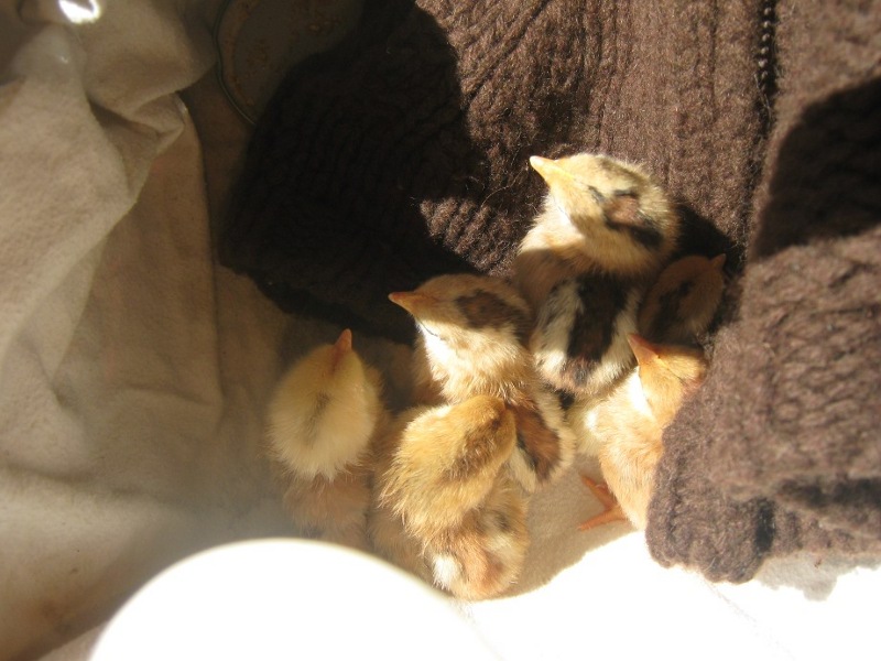 i pulcini sono qui in casa in una scatola di cartone, con un lenzuolino di ciniglia sotto, avvolti in un maglione di lana, con cibo a disposizione.