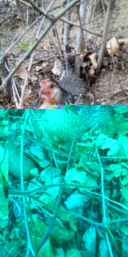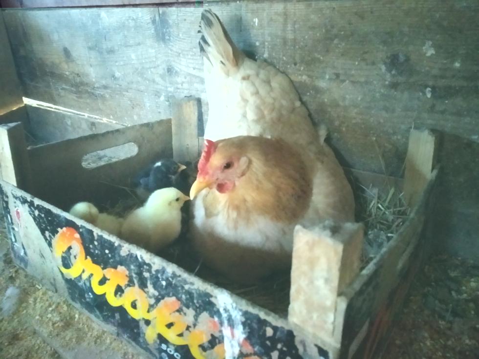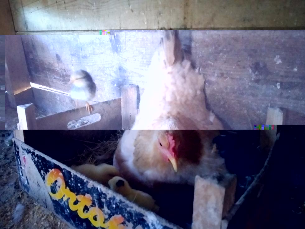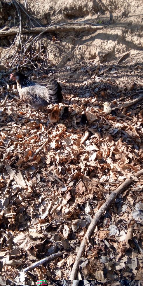 Credo che non ricordate ma alcune delle mie galline da un paio di anni hanno deciso di vivere libere nel bosco. Ebbene, oggi ne ho trovata una con 5/6 pulcini nati ieri oppure oggi. Me ne sono accorto perché il gatto è andato a disturbare e 2 di questi sono caduti dal muro per 4 metri. Fortunatamente il cane li ha recuperati in mezzo alla legna e me li ha portati.