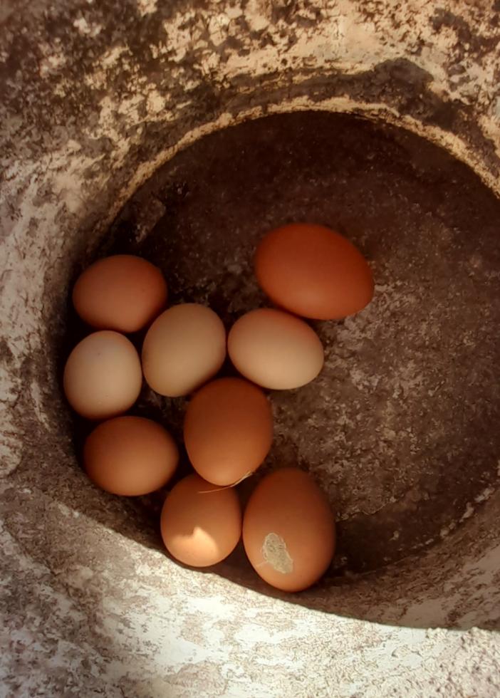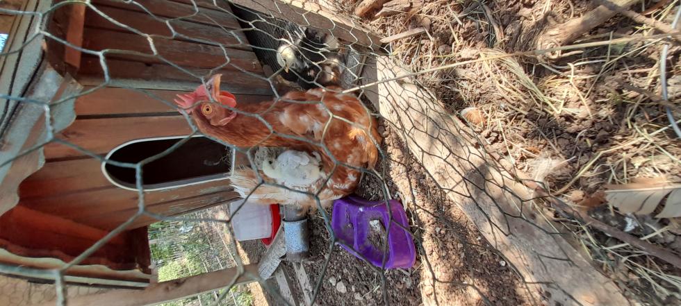 Chioccia con pulcino sulla schiena e raccolto di oggi nel secchio del mangime...